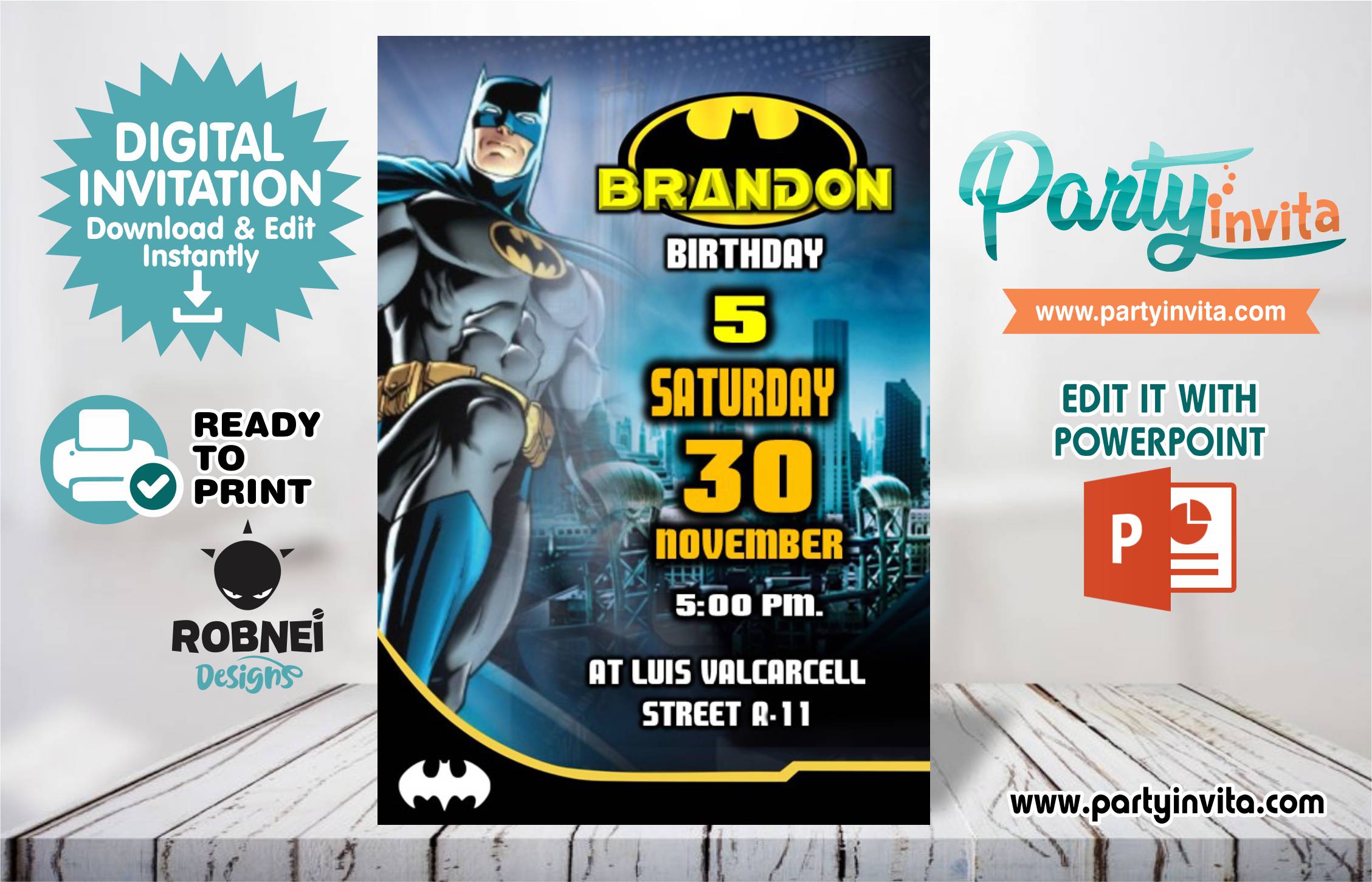 Are you planning a thrilling Batman-themed party? Our editable Batman invitation in PowerPoint is exactly what you need! This customizable template allows you to personalize every detail: simply open the file in PowerPoint, edit the name, date, and party details, then save it as a PDF or video to share with your guests.