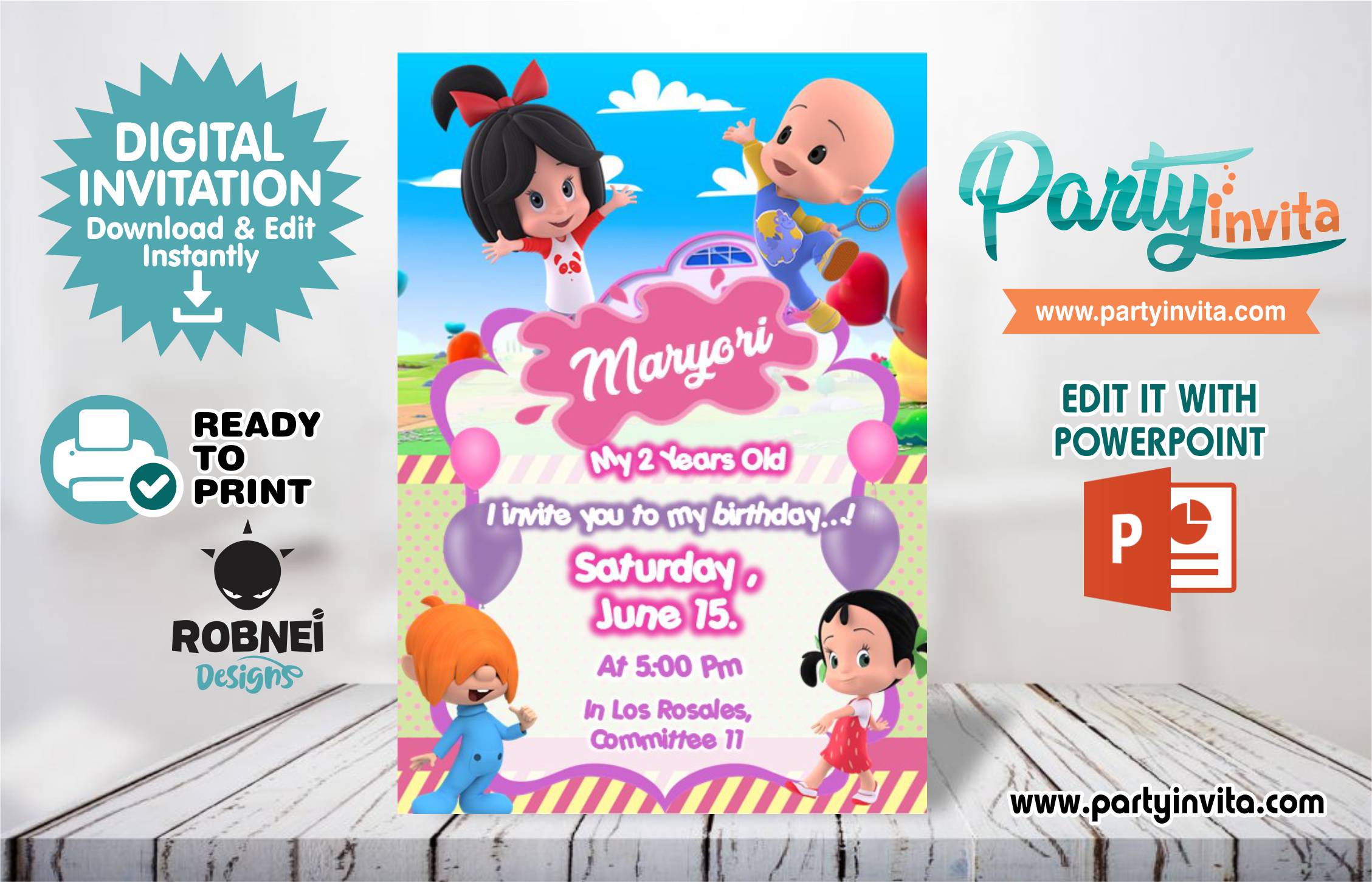 Invitación editable de Cleo y Cuquín en PowerPoint: ¡Perfecta para tu fiesta de temática musical!