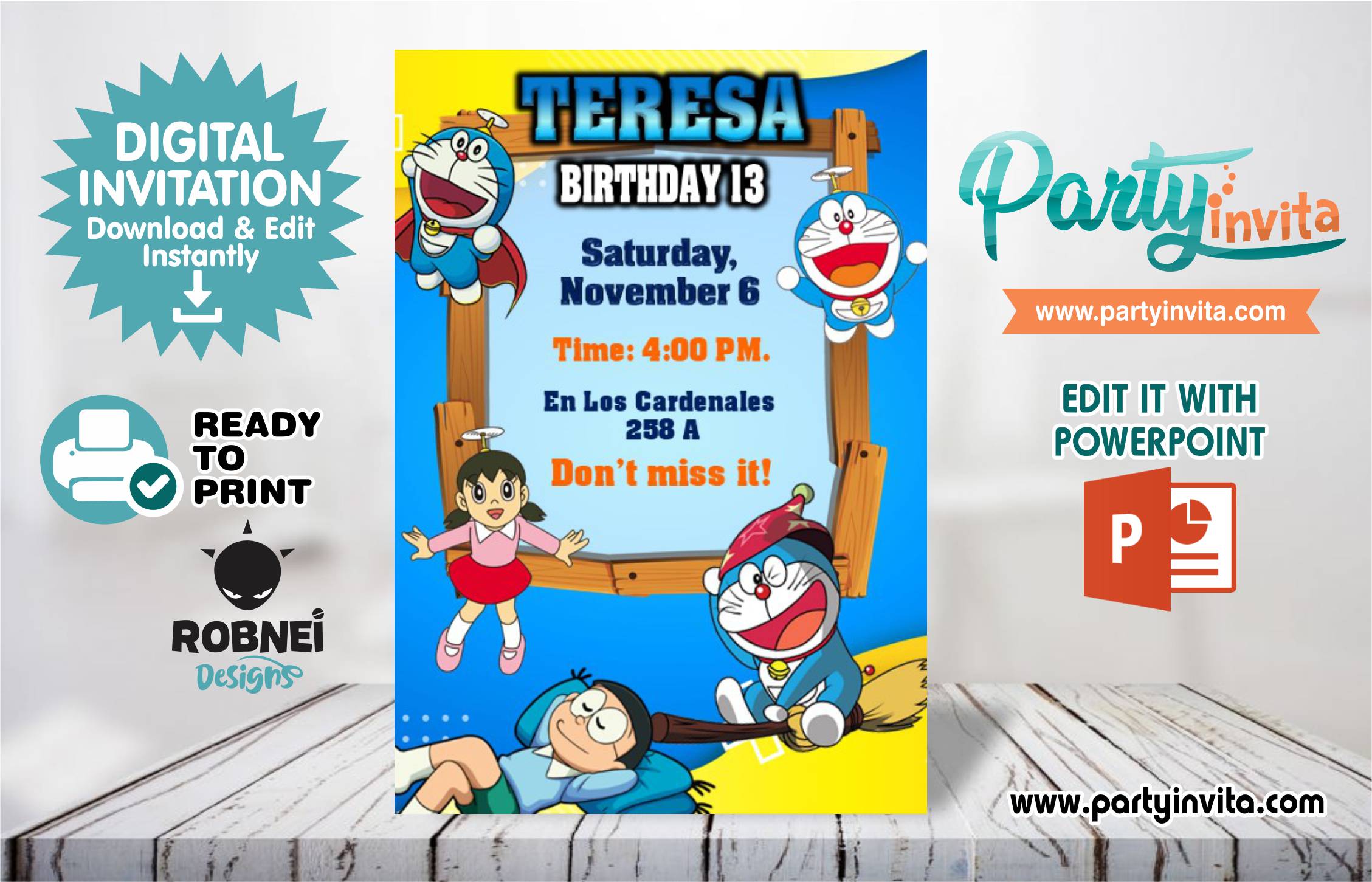 ¿Estás planeando una fiesta divertida y emocionante con una temática de Doraemon? ¡Nuestra invitación editable de Doraemon en PowerPoint es justo lo que necesitas! Esta plantilla personalizable te permite personalizar cada detalle: simplemente abre el archivo en PowerPoint, edita el nombre, la fecha y los detalles de la fiesta, luego guárdalo como PDF o video para compartirlo con tus invitados.
