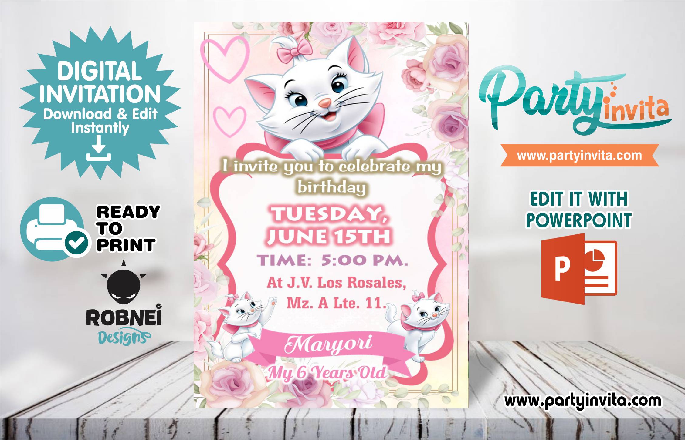 Are you planning a fun and exciting “Marie the Kitten” themed party? Our editable invitation for Marie in PowerPoint is exactly what you need! This customizable template allows you to personalize every detail: simply open the file in PowerPoint, edit the name, date, and party details, and save it as a PDF or video to share with your guests.