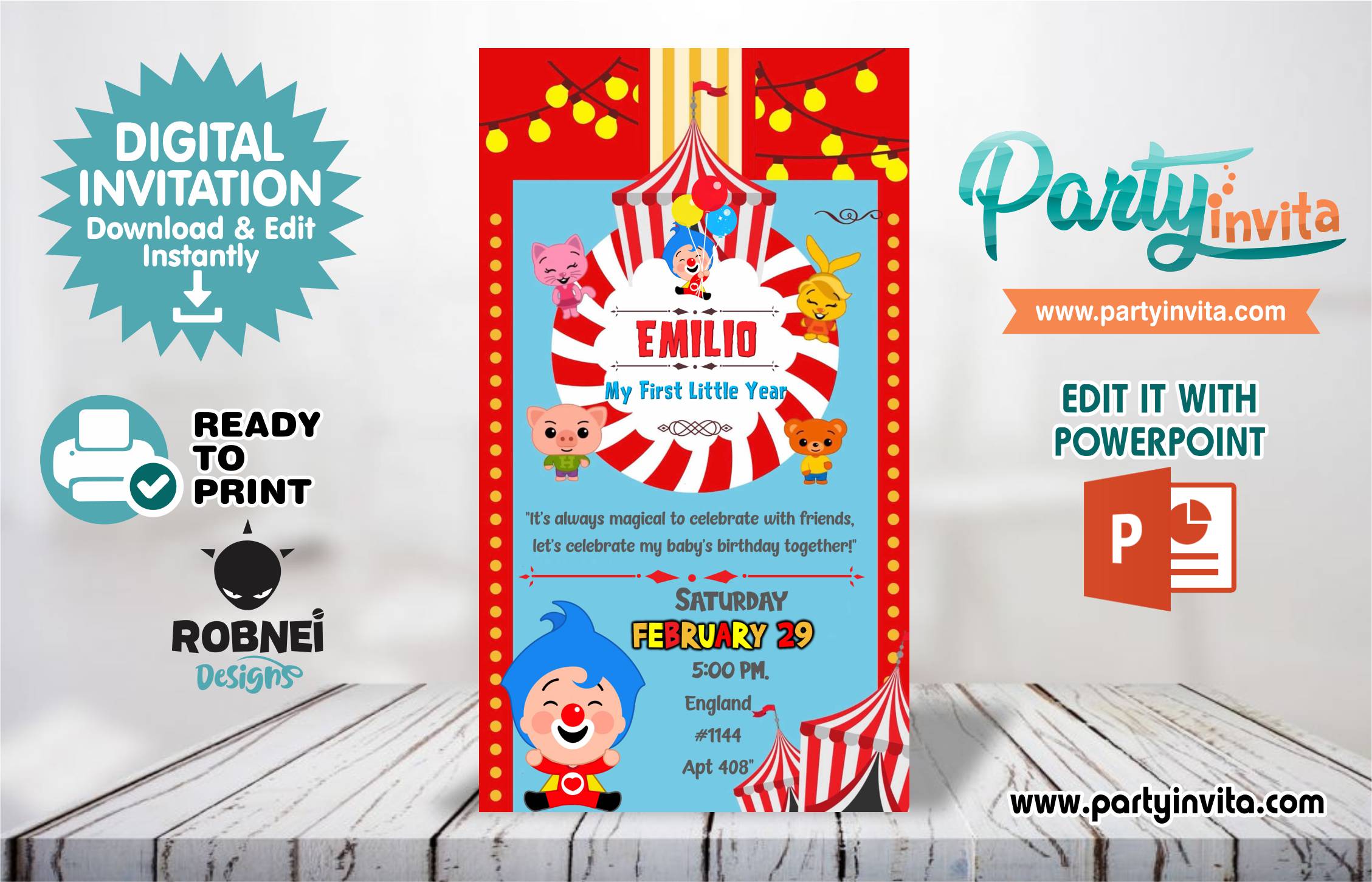Download your editable Plim Plim Boy invitation in PowerPoint today and get ready for a fantastic party!