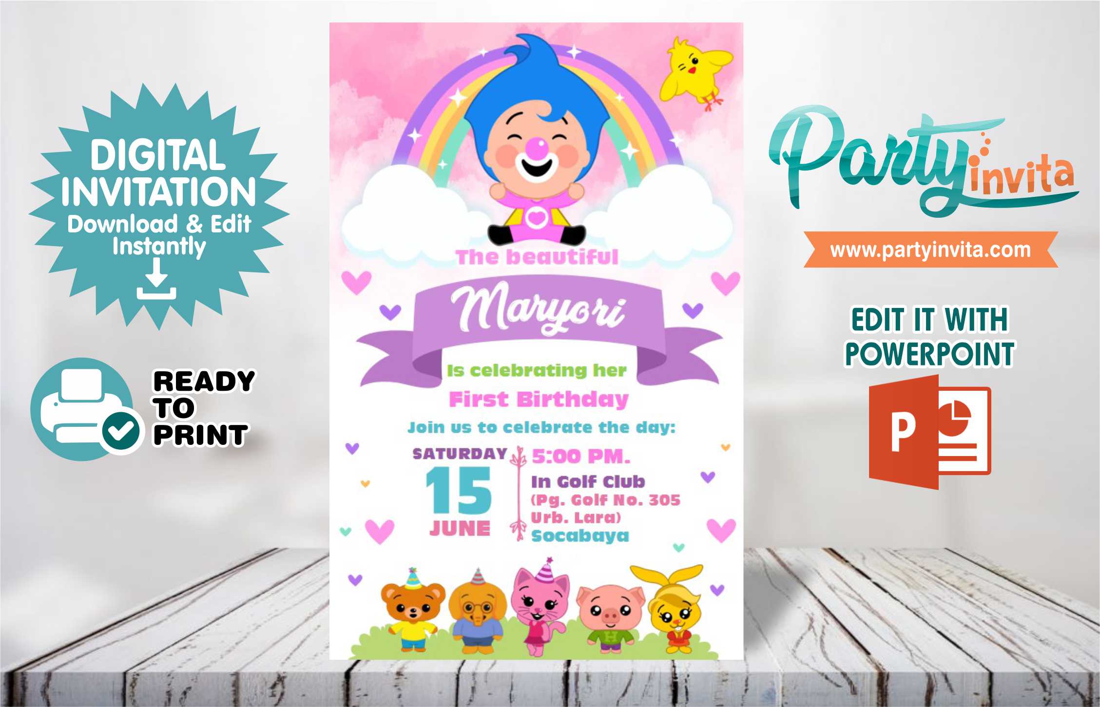 Invitation for Plim Plim Girl themed party, editable design in PowerPoint, very easy to edit, edit and print at home, perfect also for using as a virtual or digital invitation to send via Facebook, Whatsapp, Instagram, and other social media platforms.