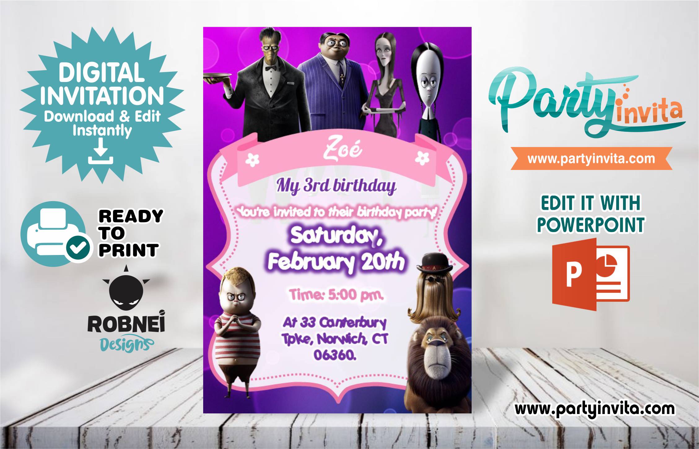 Are you planning a fun and exciting “The Addams Family” themed party? Our editable invitation for The Addams Family in PowerPoint is exactly what you need! This customizable template allows you to personalize every detail: simply open the file in PowerPoint, edit the name, date, and party details, and save it as a PDF or video to share with your guests.